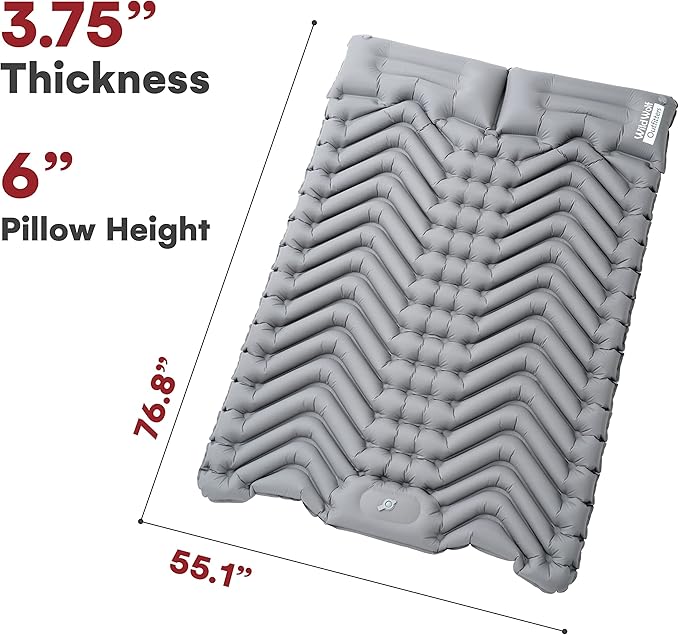 - The double sleeping pad measures 76.8" x 55.1" x 3.75" with a pillow height of 6" when fully inflated. The 3.75 inches thickness of this camping mat can withstand rocky terrain and insulates against cold temperatures making it ideal for camping and backpacking.