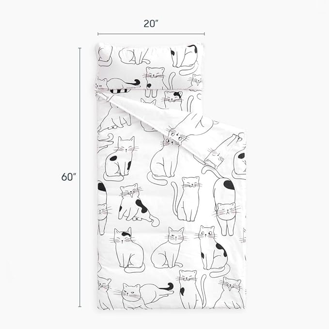 Wake In Cloud - Toddler Nap Mat with Pillow and Blanket, 100% Cotton Fabric, for Kids Boys Girls in Daycare Kindergarten Preschool, Roll Up Sleeping Bag, Black White Cats, Extra Long