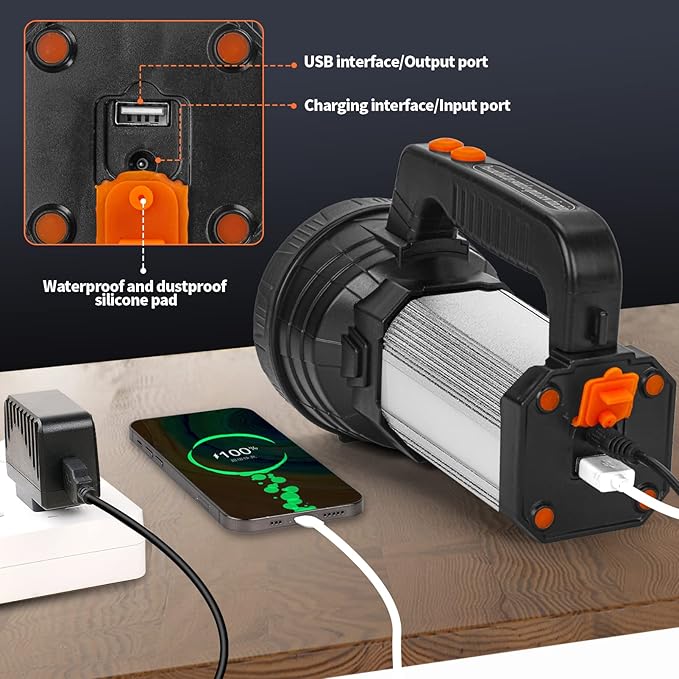 - ➤ POWER BANK FUCTION: The rear of the spotlight have a USB interface can serve as a power bank for your mobile phone, camera, digital product in emergency.