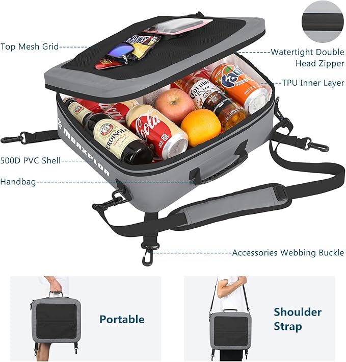 - Paddleboard Cooler Mesh Top Pocket Easy &Reliable to Use:The zipped mesh top keep your items handy and organized.The included hooks allow easy installation to D-rings and bungees.The side handle makes carry the waterproof sup cooler and deck bag like a breeze.