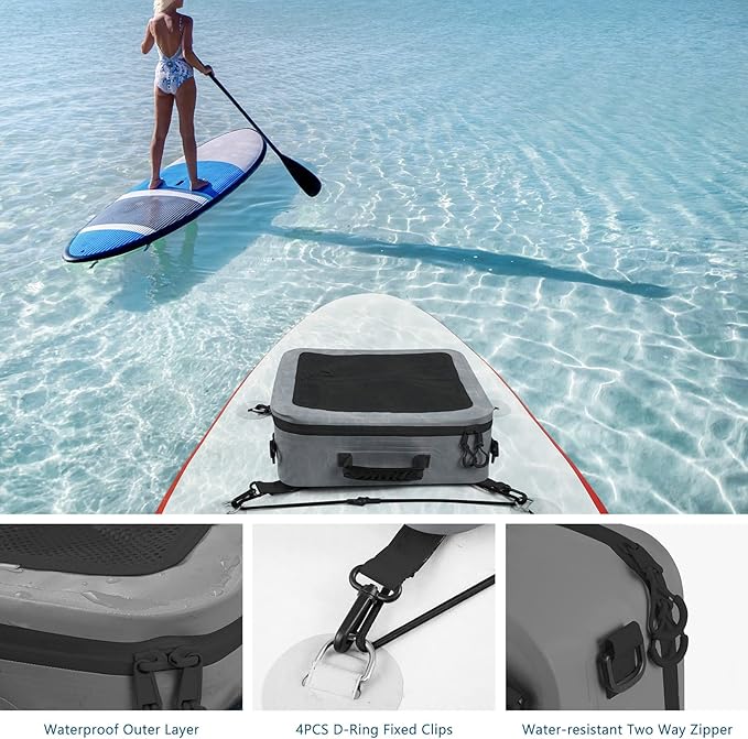 - Cooler Bag for Paddleboard with Waterproof Material 500D PVC:All seams and handles are all electrowelded together to ensure structure strong to make sure this deck paddleboard cooler bag have longer service time.The truly waterproof material will keep your bag under low temperature for longer time than common sewing paddle board cooler.