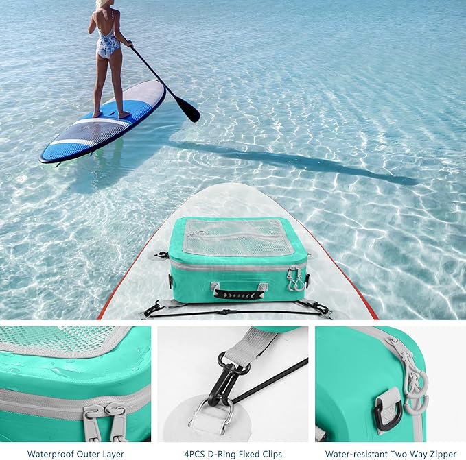 - Cooler Bag for Paddleboard with Waterproof Material 500D PVC:All seams and handles are all electrowelded together to ensure structure strong to make sure this deck paddleboard cooler bag have longer service time.The truly waterproof material will keep your bag under low temperature for longer time than common sewing paddle board cooler.