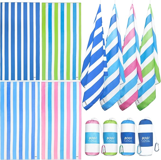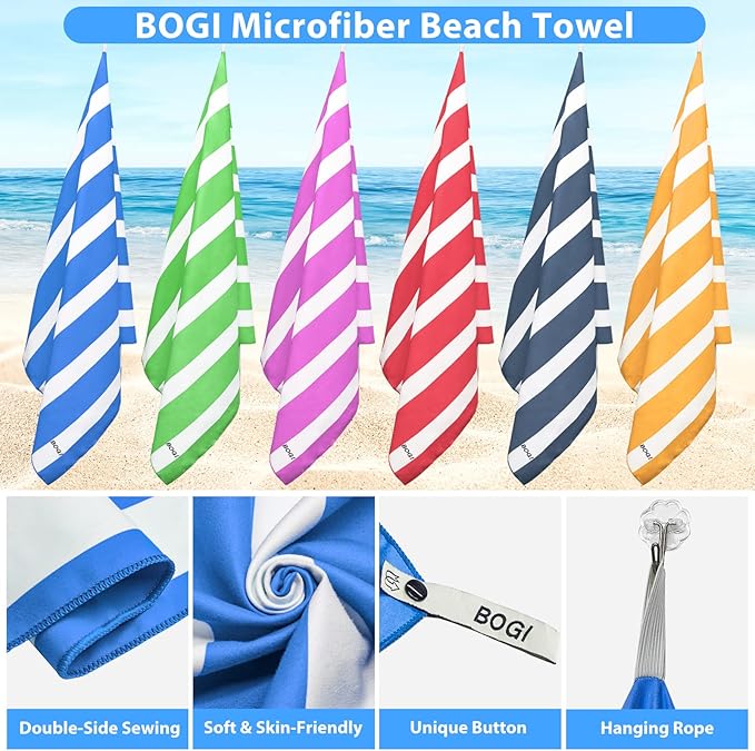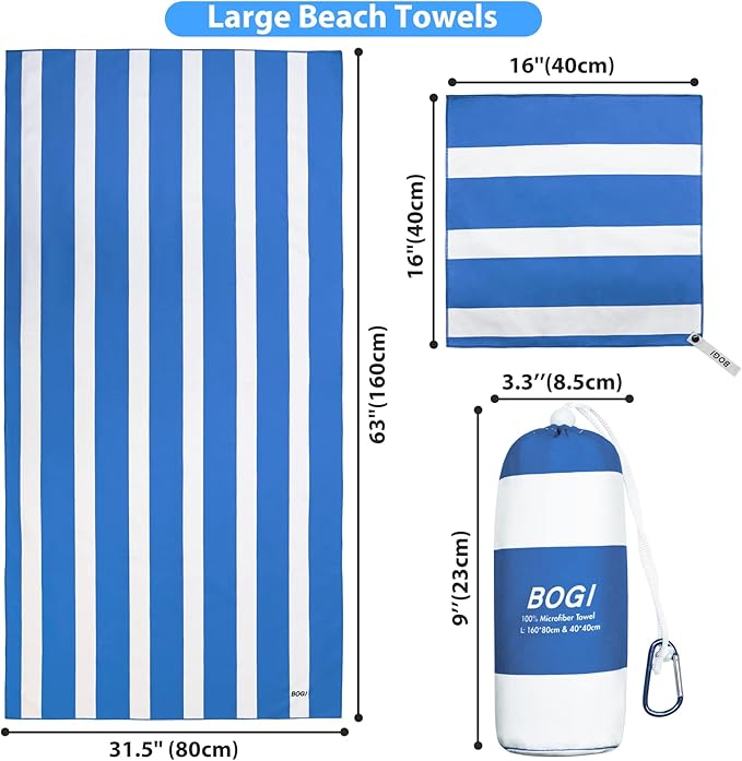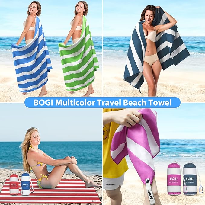 - Microfiber,Super Soft Material: BOGI microfiber beach towel is made of microfiber. The material is eco-friendly, no faded and no smell. High quality microfiber make it totally smooth and soft. It has special characteristics–super soft, quick dry ,absorbent and sand free.The microfiber towels for beach can be also as a sports&travel towel or as a mat for beach,bath,pool,swimming,boating,spa, water park, mountaineering,fitness, yoga,travel, camping,hiking,picnic,travel,outdoor&sport.