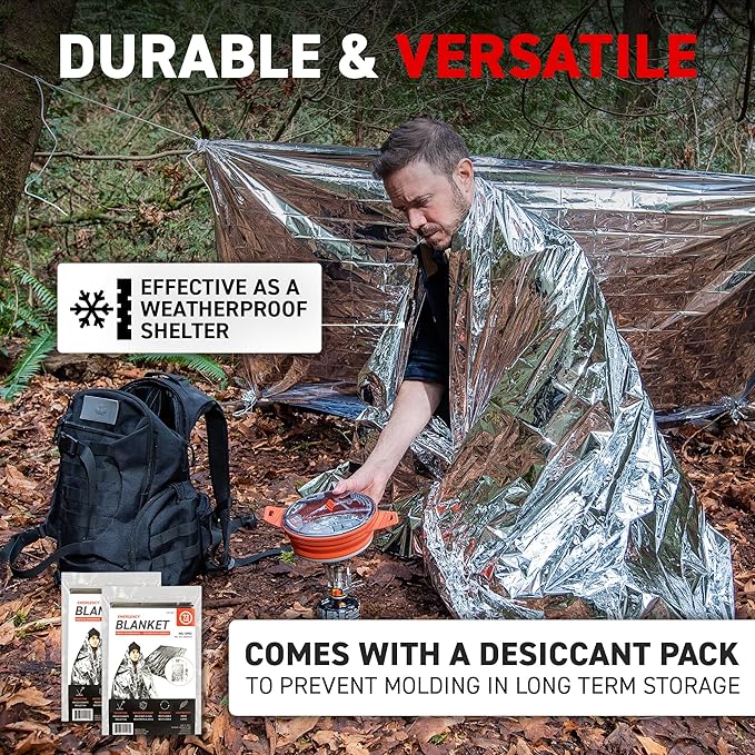 - DURABLE & REUSABLE –– These durable and advanced aluminium dual-sided reflective thermal blankets meets the United States Military Standard and are excellent for conserving body heat in emergency survival situations. This is a long-lasting product made of high-quality material that will consistently serve you in your adventures ahead. Silica gel included allowing for longer term storage of these foil tarps.