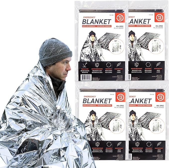 72 HRS MIL-SPEC Emergency Space Blankets – Mylar Survival or Emergency Thermal Blankets for Camping, Hiking, Marathon, First Aid, Emergency Preparedness, Extreme Weather, Shelter (4-Pack)