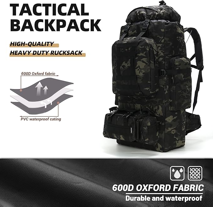 - 【Waterproof and Breathable Fabric】: The 100l tactical military backpack is made of 901D Oxford cloth fabric and waterproof material. The military backpacking bag thick density Tear Resisten Oxford cloth fabric is waterproof and wear-resistant, and the texture is tough and odorless. For traditional hiking backpacks, belts and high-quality zippers are better with durability and scratch resistance.