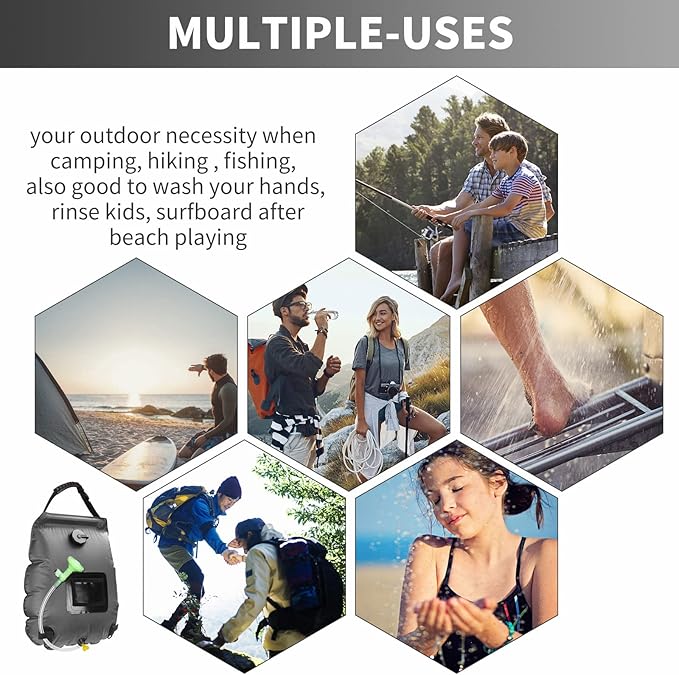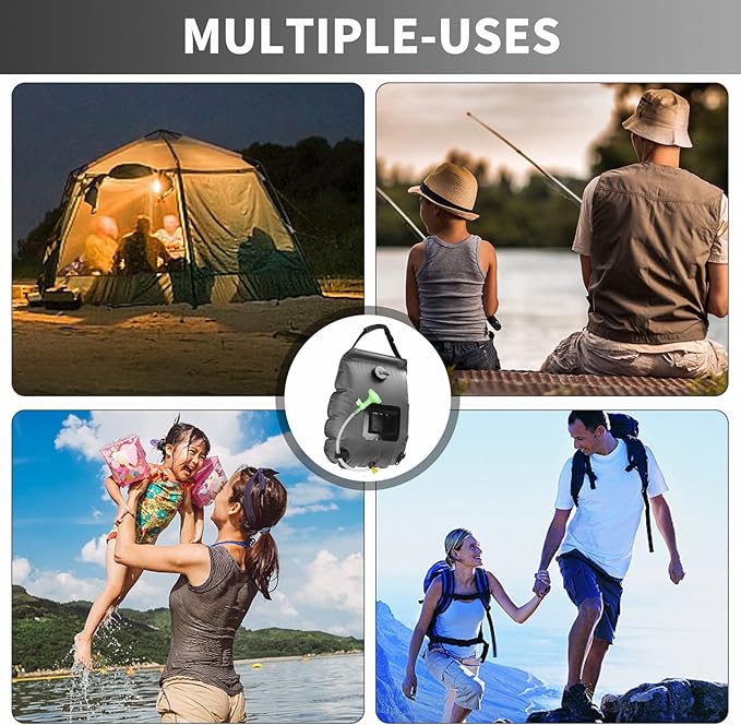 - WIDE RANGE OF USES - This camping showers is suitable for outdoor activities such as camping, backpacking, hiking, fishing or hunting, our portable shower bag is one of the indispensable outdoor equipment accessories for you and your family.It is also the best gift for Father's Day and the perfect camping accessory for men your husband and your children.