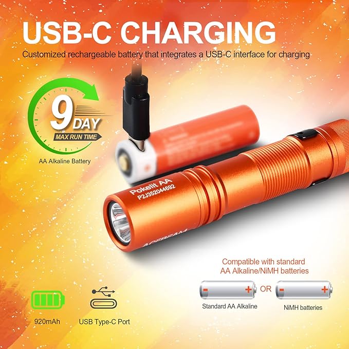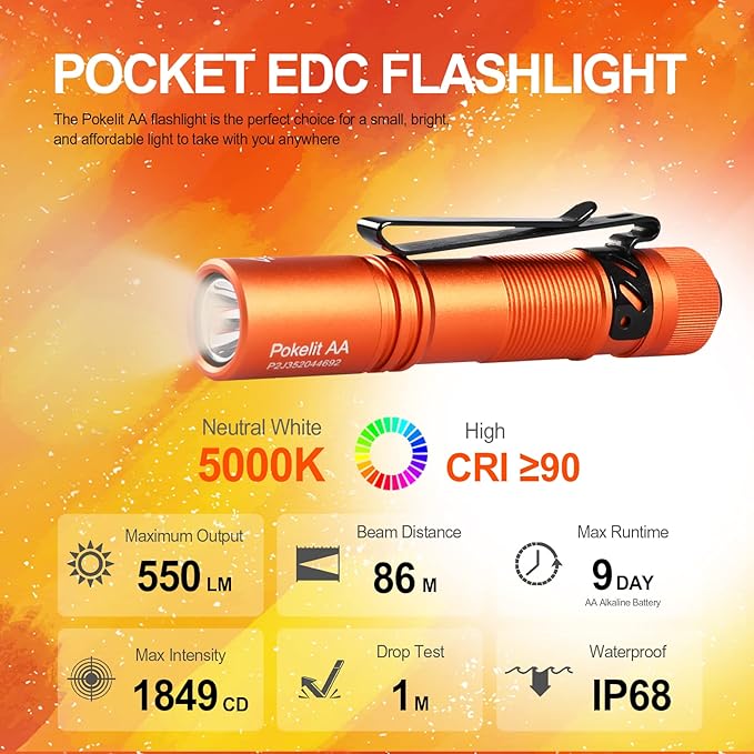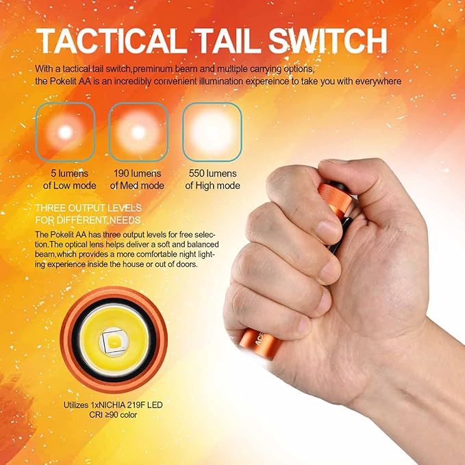 - High Performance Flashlight:Pokelit AA pocket flashlight emits bright light up to 550 high lumens. Featured with 3 light modes: High / Medium / Low (With memory function), running time up to 53 hours,perfectly meet the various needs of daily use, Pokelit AA will be your perfect companion.