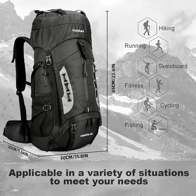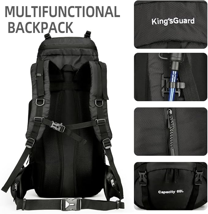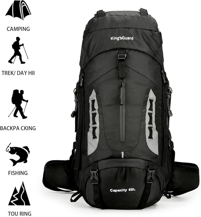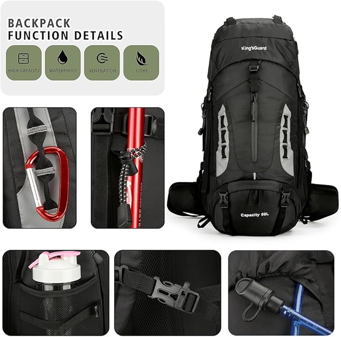 King'sGuard 60L Hiking Backpack Men Women Camping Backpack Waterproof Backpacking Mountaineering Climbing Daypack with Rain Cover (Black)