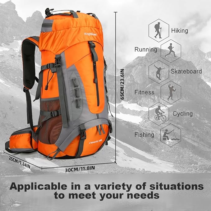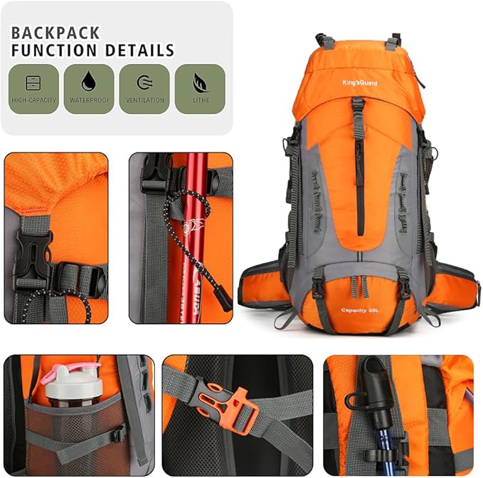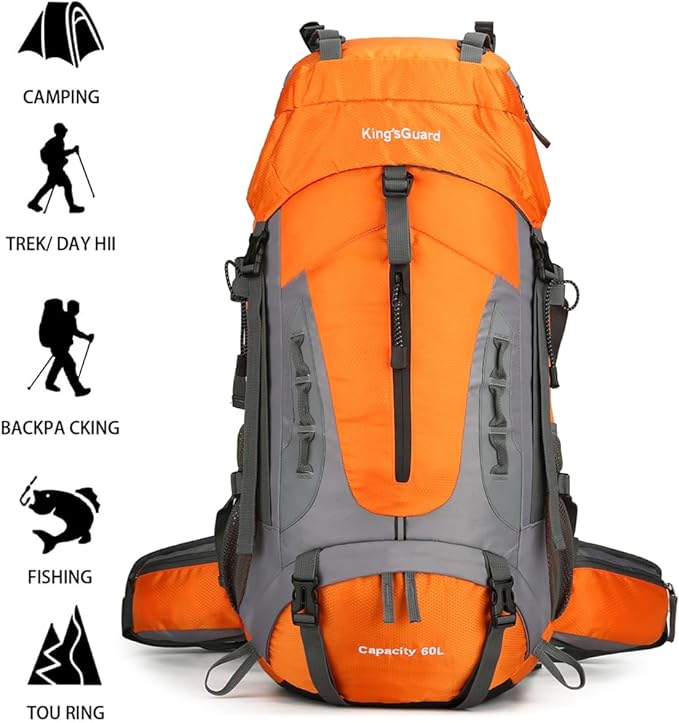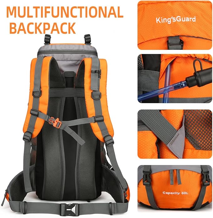 King'sGuard 60L Hiking Backpack Men Women Camping Backpack Waterproof Backpacking Mountaineering Climbing Daypack with Rain Cover (Orange)