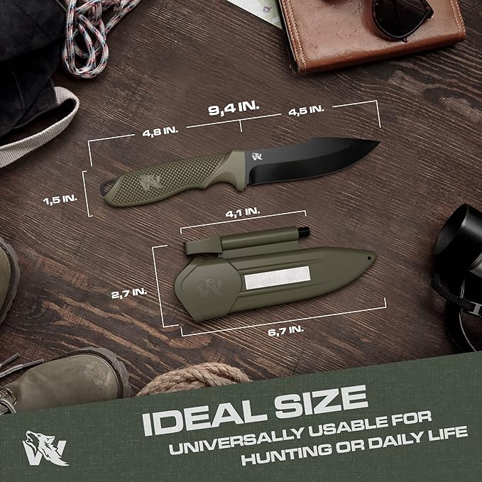 - HIGH-QUALITY MATERIAL - The fixed blade hunting knife with sheath is made of a single piece of strong D2 steel. The steel is characterized by rust resistance, resilience, and robustness. This makes the full tang knife a faithful companion.