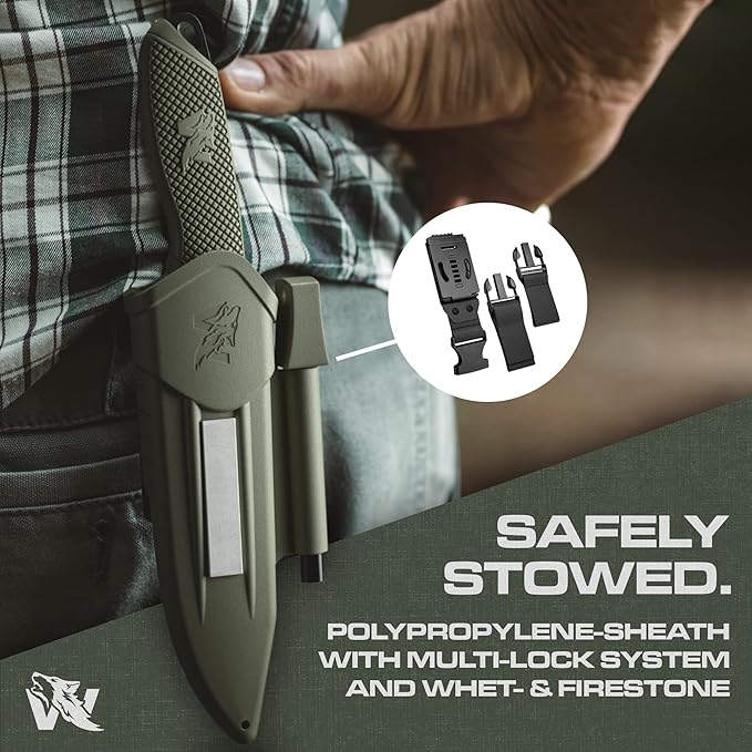 - FIXED BLADE KNIFE SET - You will receive a comprehensive outdoor set with a strong survival knife with sheath and fire starter. Multi-Lok and Belt Loop complete the set. Well prepared for a real outdoor adventure. The perfect gift for a real man.