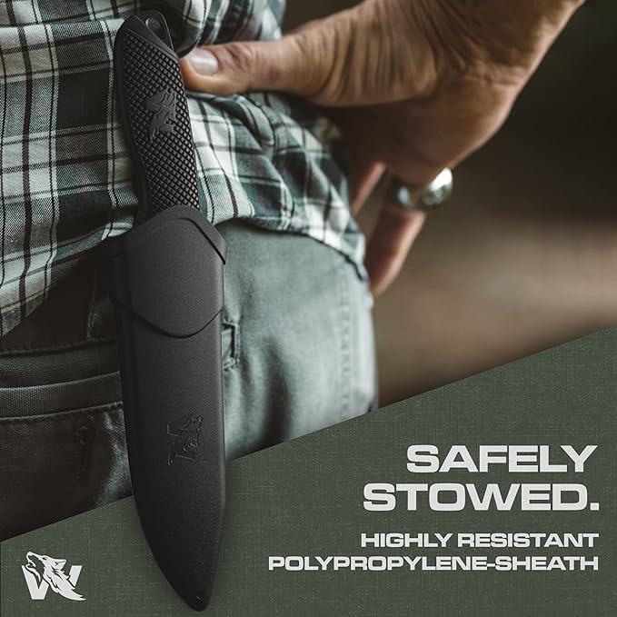 - POLYPROPYLENE SHEATH - The bushcraft survival knife comes in a hard sheath made of polypropylene and can be securely locked in it. The sheath can be comfortably hung on your belt. Always safe and handy when you need the belt fixed blade knife.