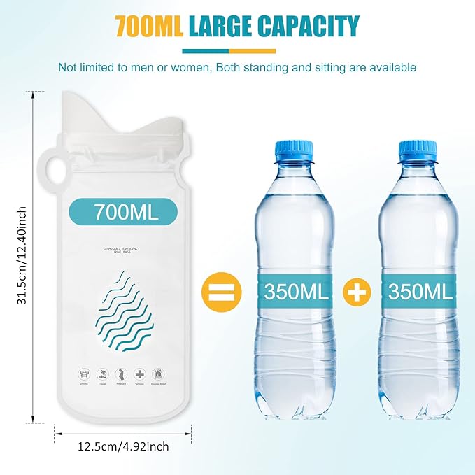 - Large Capacity & Portable: This emergency portable urine bag capacity is about 700 ml, and the urine can be absorbed the liquid into the gel within 45 seconds; the foldable pee bag is enough to fit in your pocket, purse, backpack, or vehicle glove box.