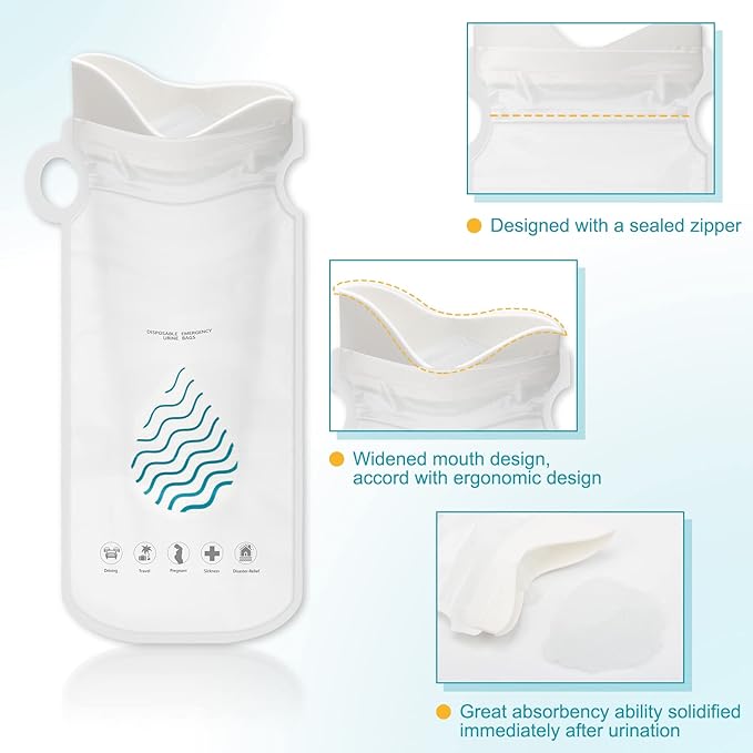 - Warm Tips: The portable urinal bag it's easy to use, just open the urinal bag, then use it. The disposal urine bag is equipped with absorbent cotton sheets and can be absorbed into the liquid into the gel within 45 seconds. At the same time, our disposal urine bag can absorb urine, vomit, or other liquid waste.