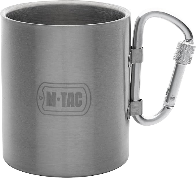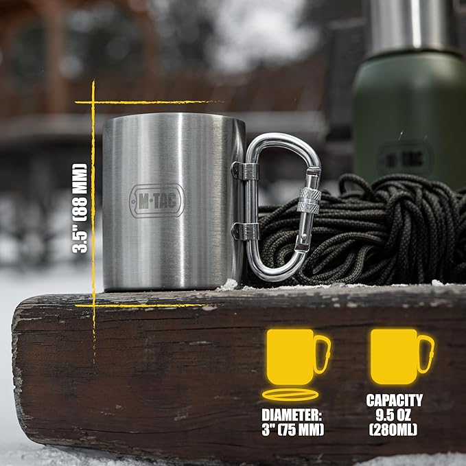 - The M-Tac thermal cup is a double-wall vacuum-insulated stainless steel cup with a capacity of 9.5 Oz (280 ml), a height of 3.5", and a diameter of 3" (88 x 75 mm) that serve for comfortable drinking tea or coffee without worrying about getting burn. The carabiner handle lets you easily attach the mug to a backpack for easy carrying.