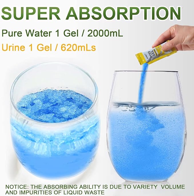 - [PREMIUM ECO-FRIENDLY & Degradable Gel] Our portable toilet chemical gel powder is mainly made of a super absorbent polymer, which can absorb and retain a significantly large amount of liquid relative to its own mass while emitting a light lemon fragrance, allowing you to always maintain an elegant environment. This absorbent gel can naturally degrade in soil composting within 7 days or in just 5 days when exposed to sunlight. It's an ideal choice for environmentally conscious travelers.