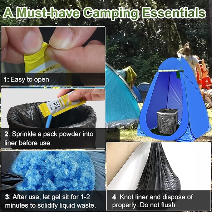 - [WIDE APPLICATION] Poo absorbent powder is widely used for camping toilet bags,portable potty bags, and other liquid waste in compost bags, portable potty bags, wag bags, urine bags, toilet bags, luggable loo bags, nursing emergency bag. Aslo be used for portable toiletet bucket, porta potty, camping toilet, and emergency toilet, etc. Also for camping, hiking, boating, fishing, beach, RV trip, long road trips, outdoor shower tents, camping showers, home care, school, hospital, nursing homes,etc