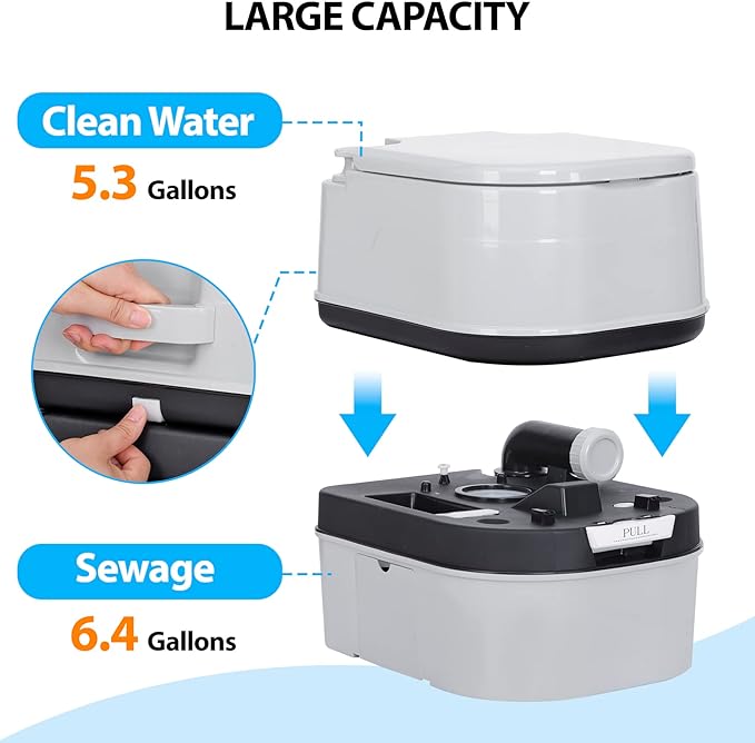 - LARGE CAPACITY - The toilet has a large capacity; The upper layer has a capacity of 5.3 gallon for storing clean water, and the lower layer has a capacity of 6.4 gallon for sewage storage; The upper and lower layers can extend the use time of the toilet and meet the needs of people with indoors disabilities or outdoor activities