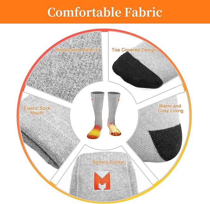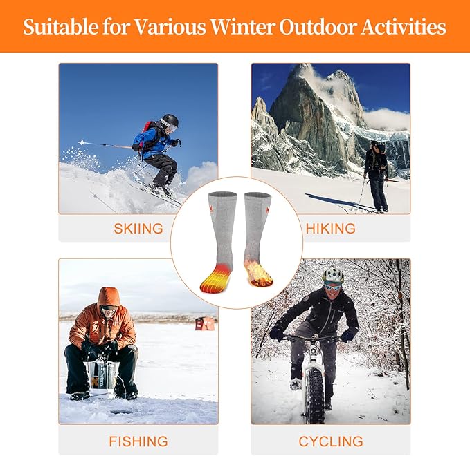 - 【Protect Your Feet】: Heating elements of the battery heated socks are made of insulated material, no worries about heating safety. Heating wire is so fine that your feet almost can not feel it. Comfortable heating temprature lets your feet no longer be cold and stiff in the cold winter.