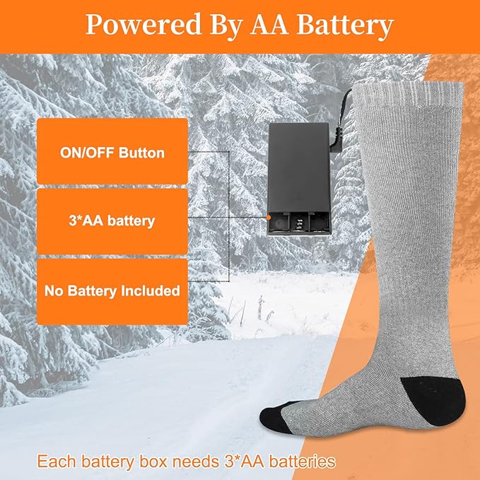 - 【Battery Heated Socks】: Electric heated socks equiped with 2 battery boxes, each battery box powered by 3*AA batteries (not included), heating time up to 5 hours. The battery on these electric socks is easily removable, so the heating sock is very esay to wear.