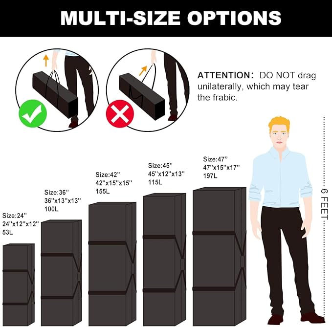 - Easy To Transport: When not in use, duffel bag folds into a flat, compact size for easy storage, taking up no space. Long duffle bag has plenty of room for storing items, good for travel and use as a tent bag, camping, cargo bag, gear bag, overnight lightweight bag, and equipment bag for all sports. Tote travel bag comfortable and convenient to carry on, and the perfect size for the seat in the car or plane