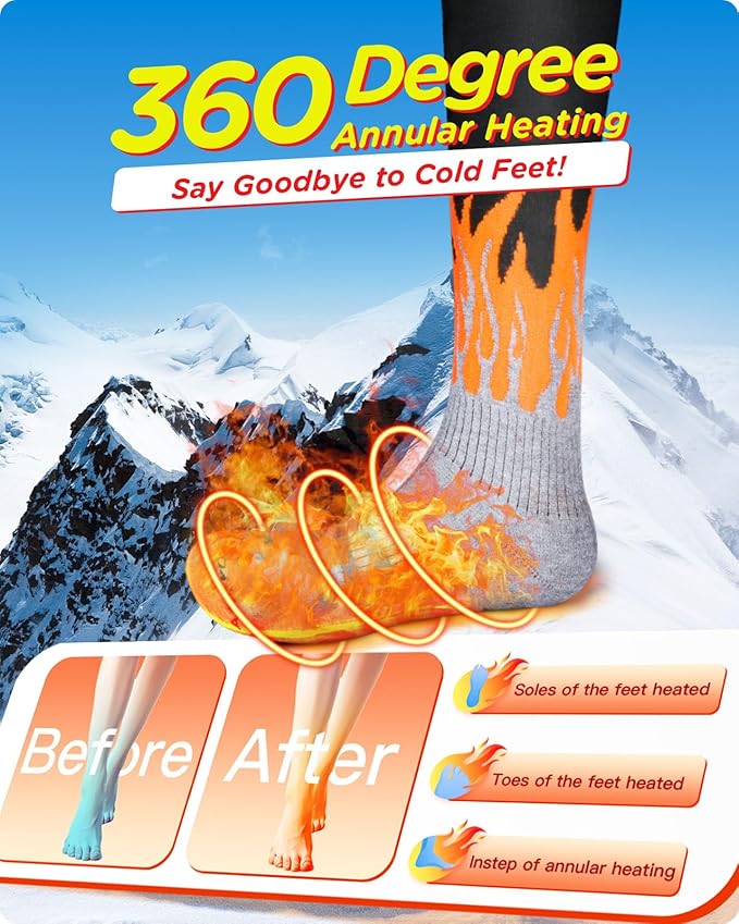 - 【360°Annular Heating Socks】 Electric heated socks with far infrared heating elements can be heated quickly in 30 seconds and evenly heated to cover your whole sole,toes and instep. Wearing a pair of our electric rechargeable battery heated socks for your feet in cold winter will stimulate feet blood circulation and no longer be cold and stiff.