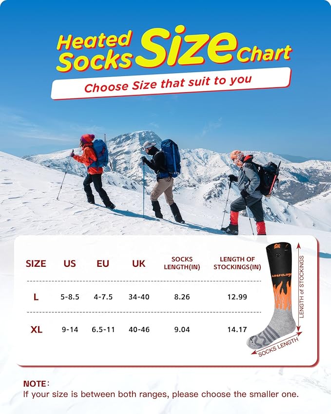- 【Unisex Size Heated Socks】These thermal heated socks can fit a wide range of sizes. XXL for size: 4-13 (US Men’s Size) / 5-14 (US Women’s Size).Men, Women, Unisex available heated socks.