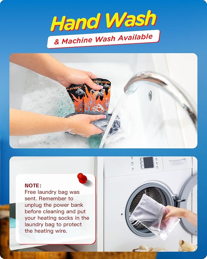 - 【Machine & Hand Washable Warm Socks】 These heated socks for men can be machine and hand washed. It also comes with washing bag so you do not worry about tearing while machine washed. Tips: Remember to remove the battery before washing. Put the charging cable back into the battery pocket before washing.