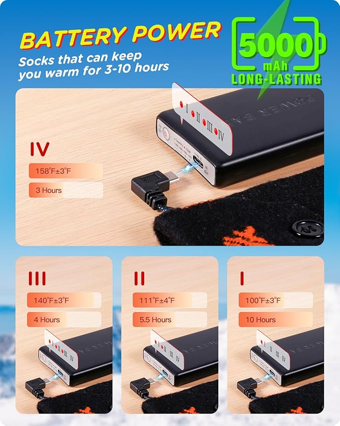 - 【5000mAh Rechargeable Battery Warm Socks】 The electric socks are equipped with a pair of 5000 mAh large capacity rechargeable batteries, it can provide 10 hours lasting warmth after 3-4 hours fully charged.