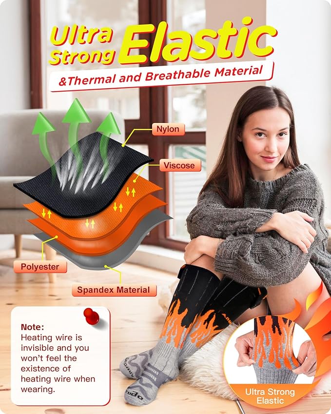 - 22.5% Viscose, 52.5% Nylon, 10% Polyester, 15% Spandex Heated Socks for men Women