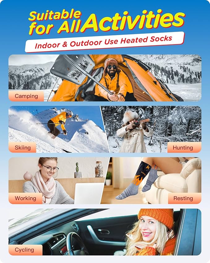 - 【Wide Application Winter Socks】 Heated socks women are suitable for many kinds of indoor & outdoor activities in winter such as fishing, camping, snowboarding, hunting, hiking and outdoor work. Perfect birthday gift,Happy Halloween gift and Christmas gift for friends and family.