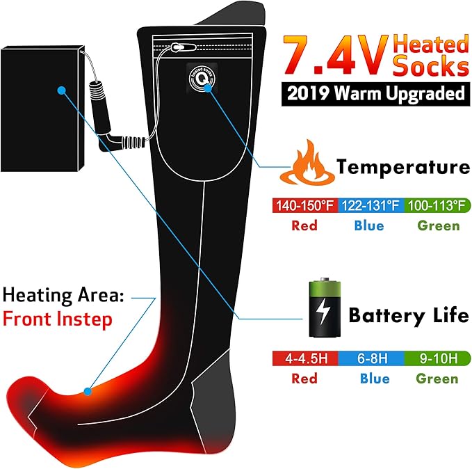 - Recommended Uses For Product : running, camping, walking the dog, snow boarding, hiking, motor cycling, cycling, 7.4V Rechargeable Battery Operated Socks, hunting, ice-fishing, shoveling snow running, camping, walking the dog, snow boarding, hiking, motor cycling, cycling, 7.4V Rechargeable Battery Operated Socks, hunting, ice-fishing, shoveling snow