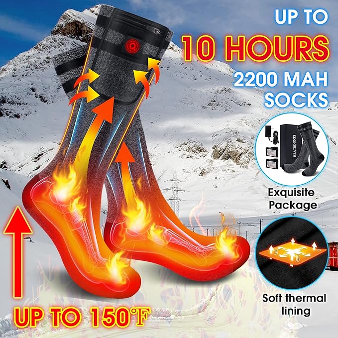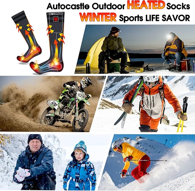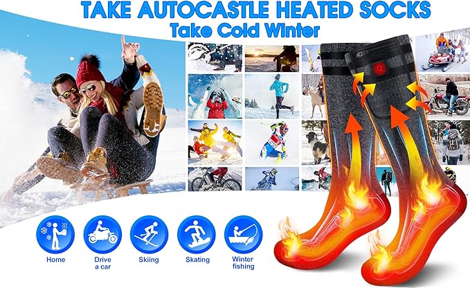 - 𝐇𝐈𝐆𝐇-𝐐𝐔𝐀𝐋𝐈𝐓𝐘 𝐌𝐀𝐓𝐄𝐑𝐈𝐀𝐋 𝐒𝐨𝐟𝐭 𝐚𝐧𝐝 𝐁𝐫𝐞𝐚𝐭𝐡𝐚𝐛𝐥𝐞: Autocastle Heating socks with super comfortable, thick cotton and well padded,Absorbent,breathable,quick-drying,elastic-thicken,use ultra-thin electric heating module.Soft Padded reinforced heel&toe accurate stitching and recessed heating element help focus heat to keep your feet warm. Autocastle winter socks have long life work time with 7.4V 2200MAH Li-po rechargeable battery can keep you warm all day.