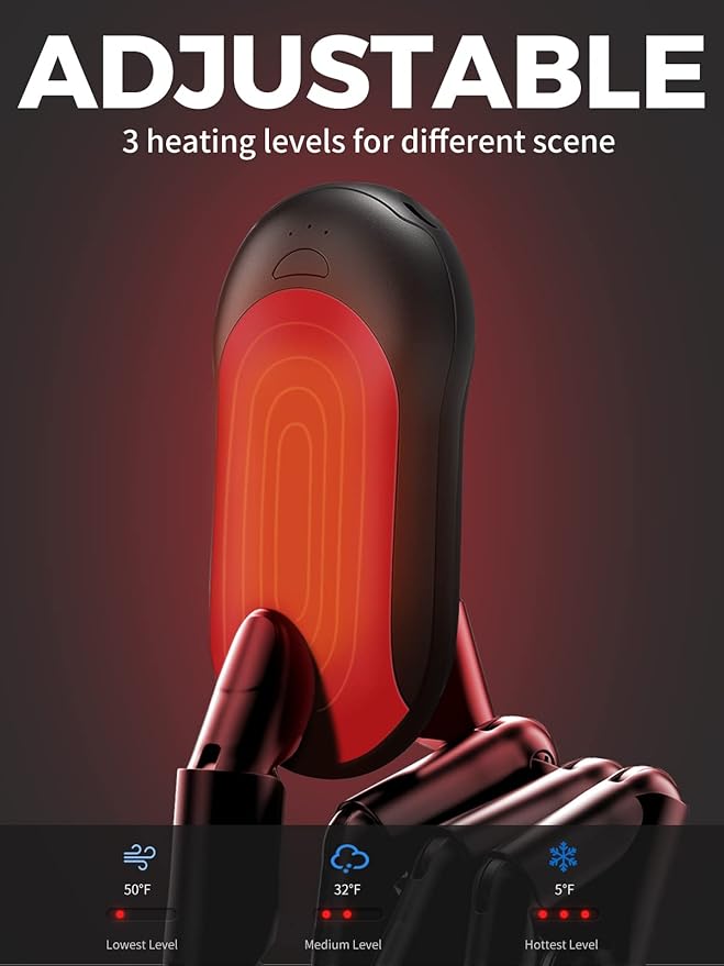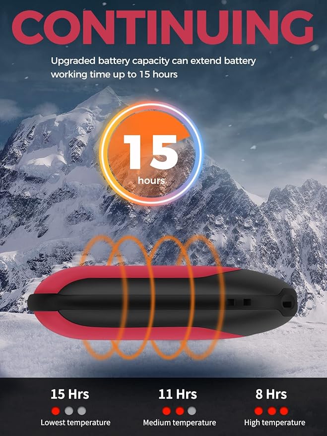 - Intelligent Heating Equipment: H01 have handy temperature controls button and 3 temperature levels to keep your hands warm in winters. High heating levels works for 8 hours, medium for 12 hours, low for 15 hours. Don't let the thought of cold fingertips keep you from your favorite outdoor activity this winter season.
