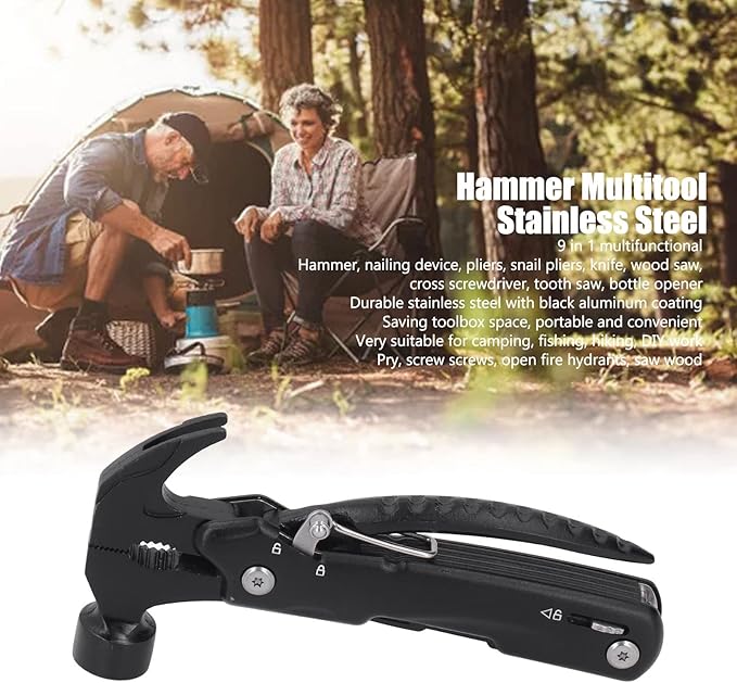 - 【UNIQUE DESIGN】Multifunctional pliers hammer, including 9 functions hammer, nail device, pliers, snail pliers, knife, wood saw, Phillips screwdriver, tooth saw, bottle opener device, 9 in 1 design to meet your various needs.