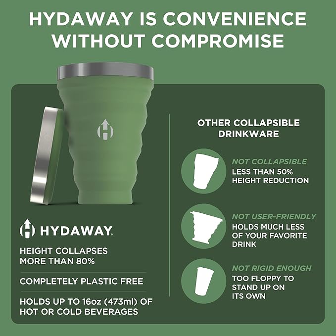 - Reduce Your Impact - HYDAWAY strives every day to lessen the impact of single-use plastic on the planet. With a practical and portable 16 oz camping cup tucked into your bag, you’ll never need a single-use plastic alternative again