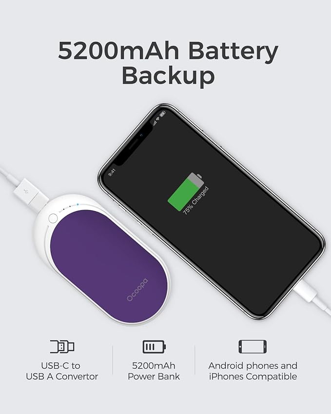 - Long-Lasting Battery: With a 5200mAh lithium rechargeable battery and USB-C charging port, you can use your hand warmer for hours and even charge your electronic devices on the go.