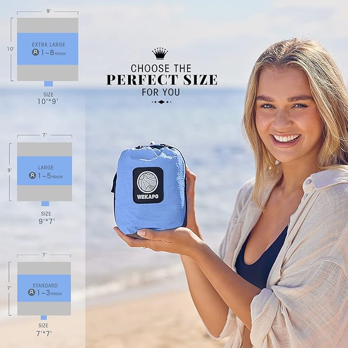 WEKAPO Beach Blanket Sandproof, Extra Large Beach Mat, Big & Compact Sand Free Mat Quick Drying, Lightweight & Durable with 6 Stakes & 4 Corner Pockets