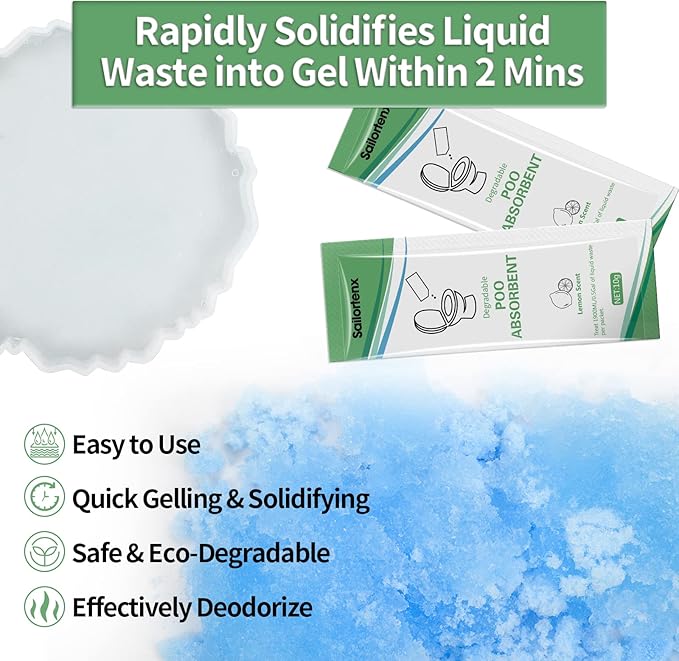 - 【FAST GELLING】The powder can quickly transform the liquid waste into solid gel within 1 to 3 minutes after use, and give out the lemon scent, helping you better deal with human waste.