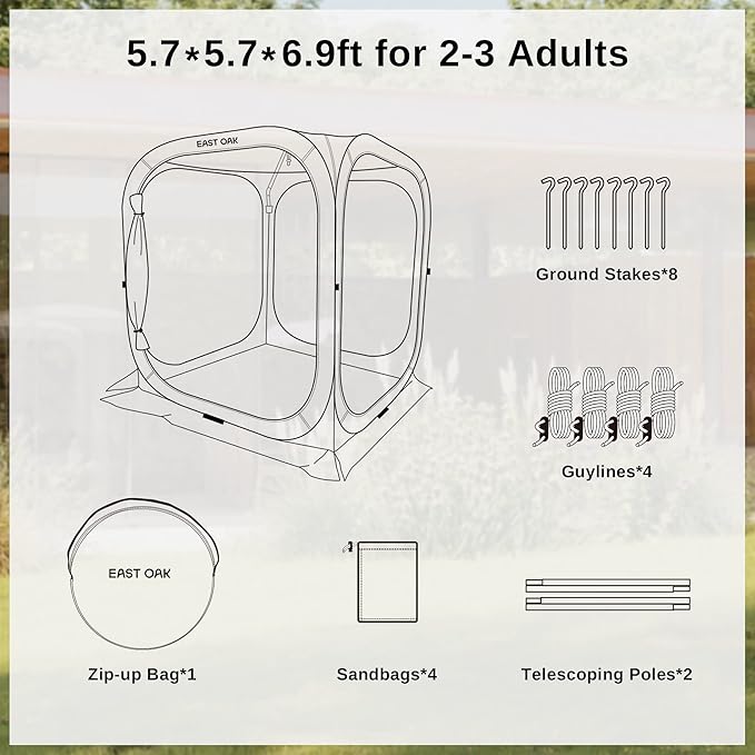 - ๐ฃ๐ผ๐ฝ-๐๐ฝ ๏ผ ๐๐ฎ๐๐ ๐๐ผ ๐ฆ๐ฒ๐ ๐๐ฝ ๐ผ๐ฟ ๐ฆ๐๐ผ๐ฟ๐ฎ๐ด๐ฒ : Suitable for 2-3 people, EAST OAK portable screen house features a convenient pop-up design that allows for easy installation by a single person in about one minute. Designed to be easily folded, the tent comes with a convenient carrying bag. Its dimensions are 31.5*3.2*31.5 inches, making it easy to store