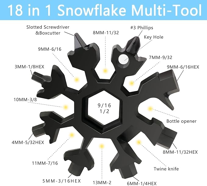 - ❄️【Snowflake Tools High-Quality Materials And Design】The 18-In-1 Snowflake Multi-Purpose Tool Is Made Of High-Quality Steel. It Has The Characteristics Of Ultra-Sturdy, Rust-Proof, Anti-Corrosion, And Excellent Hardness. This Snowflake Tool Is Durable. The Unique Snowflake-Shaped Design Allows Us To Creatively Combine The Perfect Shape Of Nature With The Functions And Design Of Our Compact Multifunctional Tools