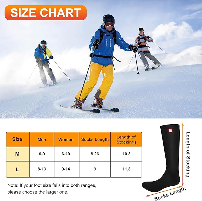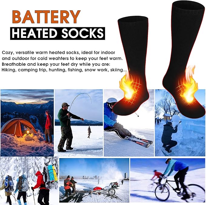 - 【Long Lasting Rechargeable Battery Powered Socks】Battery socks heated for men and women, equipped with 2pcs 3.7V 2200mAh Li-ion batteries, heating up to 3.5~6.5 hours after full charge. Long Life batteries providing you continuous warmth and comfort. Heating Area: Top Feet