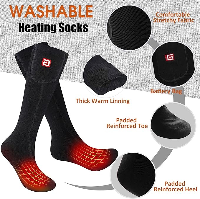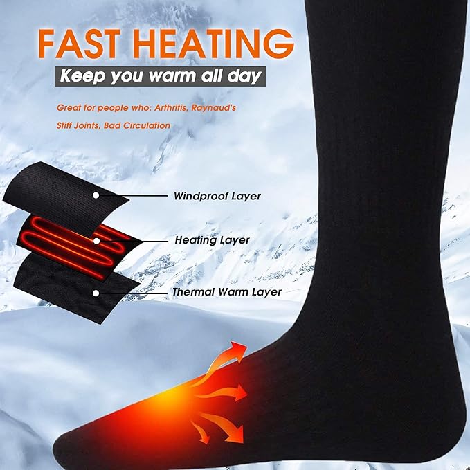 - 【Quick Warming Up Electric Heating Socks up to 150℉】Electric thermal warming socks designed with upgraded heating element inside,it can warm up quickly within 1 minute, help to stimulate your blood circulation,great for people with arthritis,raynaud's,bad circulation and stiff joints