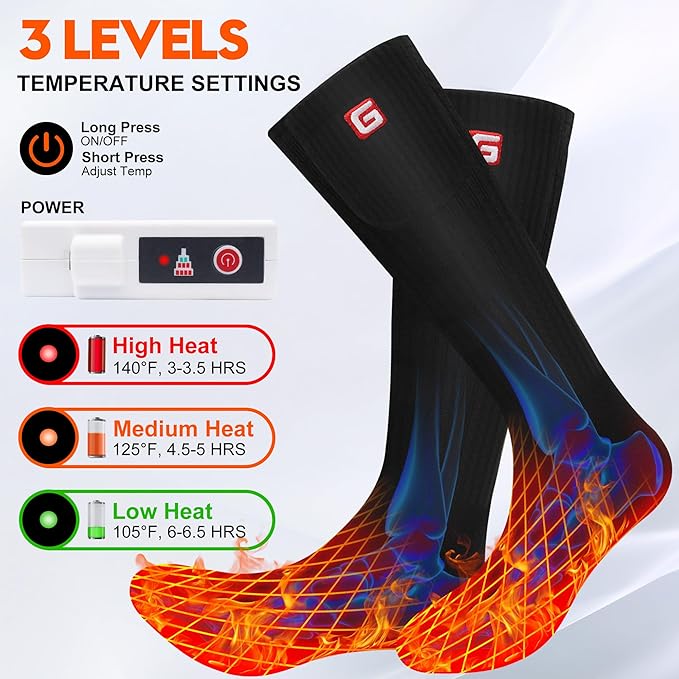 - 【3 Levels Temperature Settings Foot Warmer】The range of heat settings on these heating socks designed with 3 levels that you can choose depending on the weather. You can adjust these electric thermal socks to Low - Medium - High temperature mode(120℉-150℉).This battery powered socks are easy to use and operate - the indicator changes its color depending on a chosen level