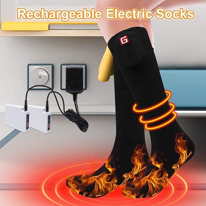 - 【Soft Breathable Insulated Material Thermal Socks】This warm winter socks made with Premium spandex fabric cotton,absorbent breathable,quick drying,elastic thickened,heat insulated and electric module using. Package including: A pair of heated socks, 2pcs batteries, 1pcs AC dual charger, 1pcs user manual and luxury packing box for gift ideal