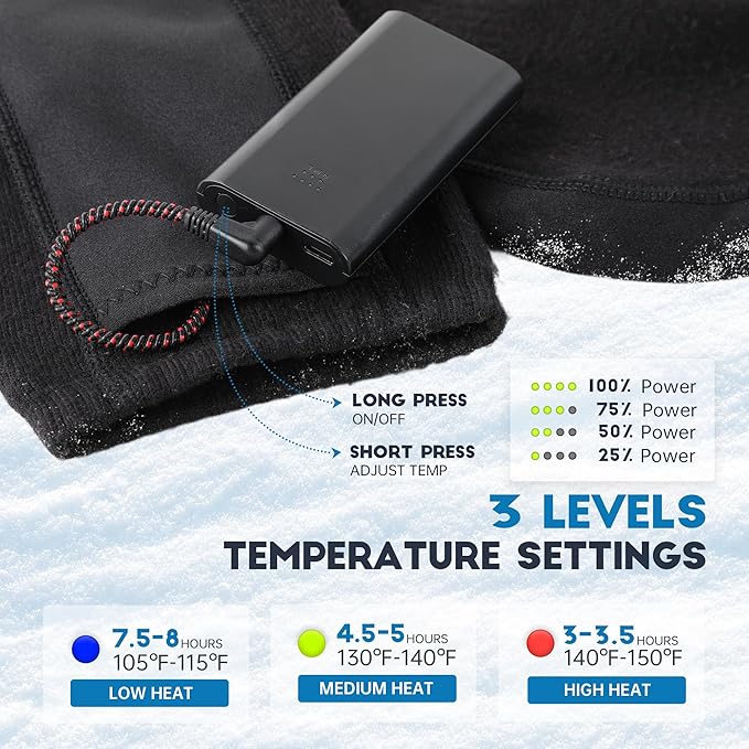 • 【3-Settings Temperature Controller】- Equipped with a remote control, paired with two 4000mAh Li-ion batteries, which can be fully charged in about 4 hours, this pair of heated socks has 3-level temperature settings. High-Red: 140℉ - 150℉ for 3-3.5 hours; Medium-Green: 130℉ - 140℉ for 4.5-5 hours; Low-Blue: 105℉ - 115℉ for 7.5-8 hours. They keep your feet nice and warm in cold weather.