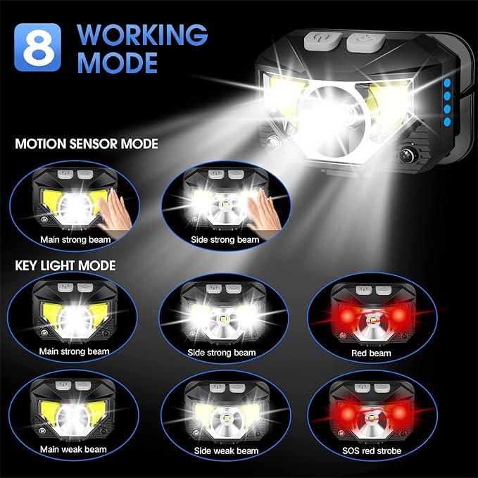 - Waterproof and 8 Modes: The headlight has IPX4 waterproof rate. The high-quality shell is more sealed and leak-proof, which is suitable for rain or snow, indoors or outdoors. The led headlamp has 8 lighting modes to meet your various needs. In key light mode, you can switch the main strong beam, main weak beam, side strong beam, side weak beam, red beam, SOS red strobe. In motion sensor mode, you can switch the main strong beam and side strong beam