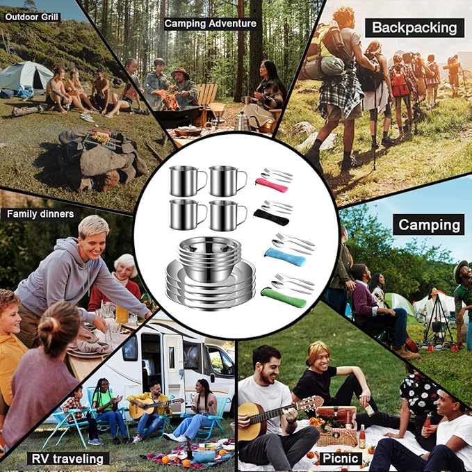 - COMPLETE CAMPING MESS KIT – Camping utensil set is designed specifically for 4 people and is portable for easy transport. Package includes 4 x Cup , 4 x Plates , 4 x Bowls , 4 x Cutlery (Knives, spoons and fork)