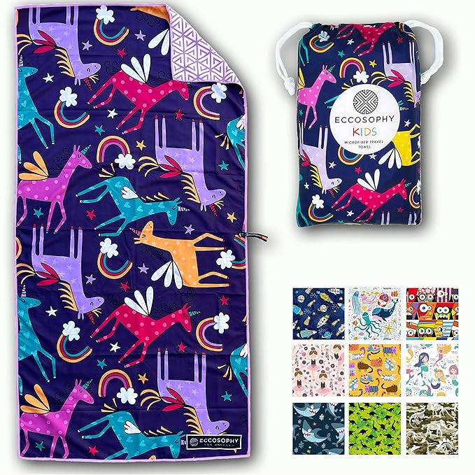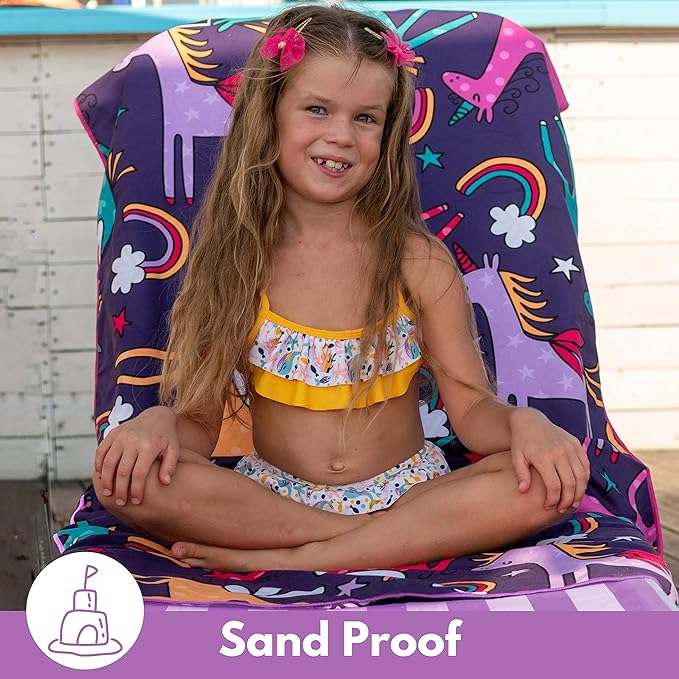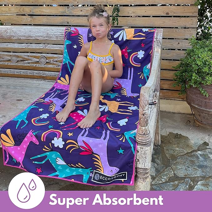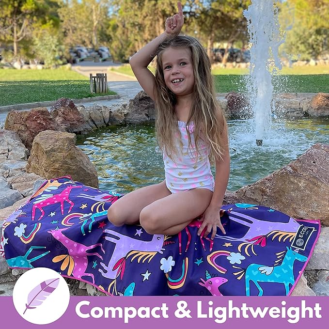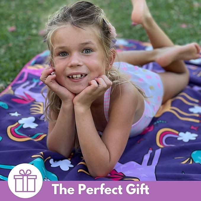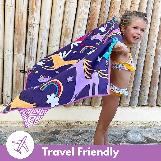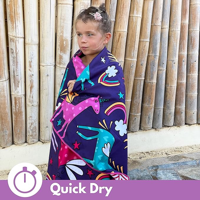 - THE PERFECT GIFT FOR GIRLS AND BOYS- Everyone needs a cute towel especially kids. They can take their favorite towel to swim practice, the beach, camping, hiking, picnics, pool parties, sleepovers, on vacation and road trips. Its a travel friendly towel ready to go with you.